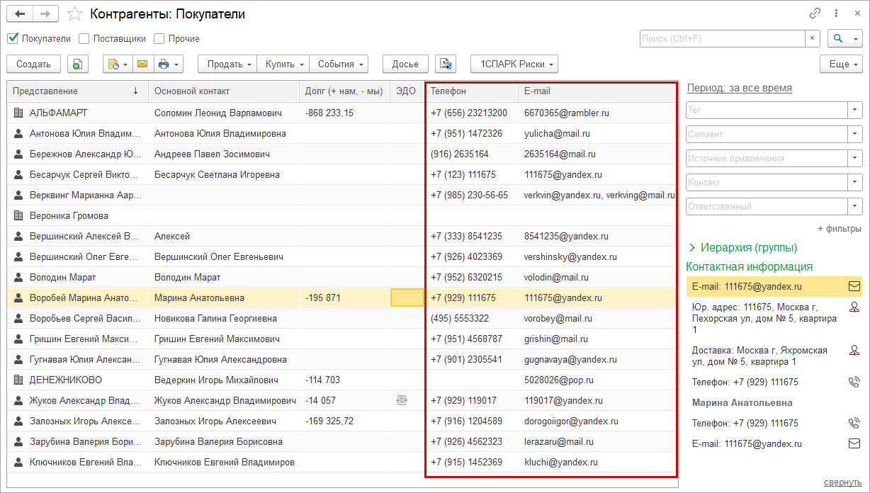 В справочниках "Контакты", "Покупатели" и "Поставщики" появилась возможность вывести в список поля с телефоном, e-mail и другой контактной информацией. Например, можно вывести телефоны для быстрого обзвона клиентов или адреса для оценки степени заполнения карточек клиентов менеджером.