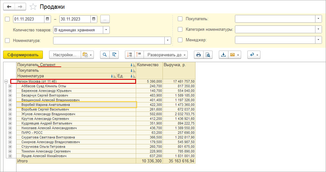 Также появилась возможность группировать информацию в отчетах по сегментам контрагентов и контактной информации. Например, менеджер может создать сегменты контрагентов по регионам и сравнить продажи по территориальному признаку.