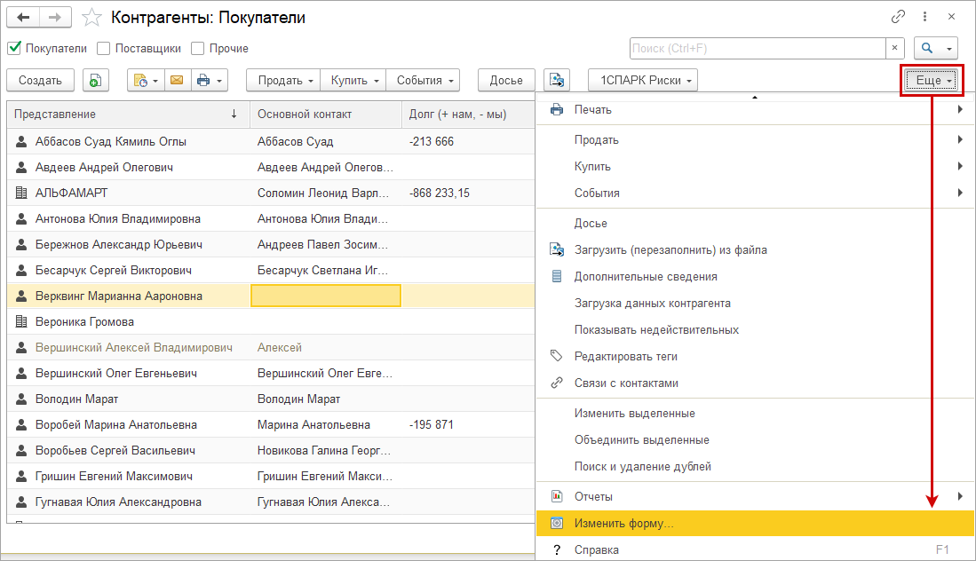 Включить отображение в списке контактной информации и сегмента можно в меню Еще – Изменить форму.