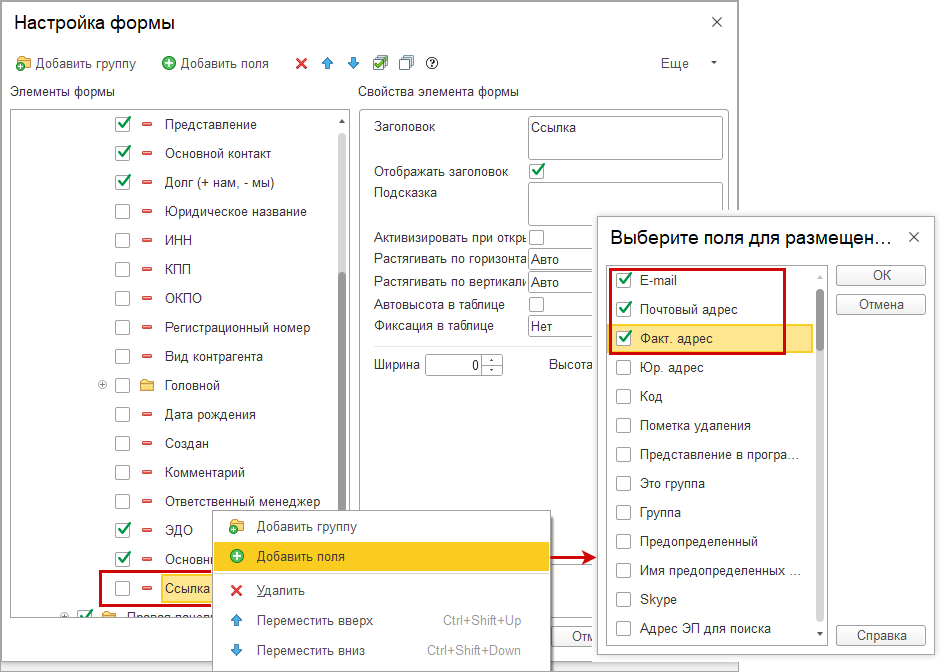 В списке элементов формы находим поле "Ссылка", нажимаем по нему правой клавишей мыши и выбираем пункт меню "Добавить поле". В открывшемся окне устанавливаем флажки напротив полей, которые необходимо добавить в список, например e-mail, телефон или сегмент.