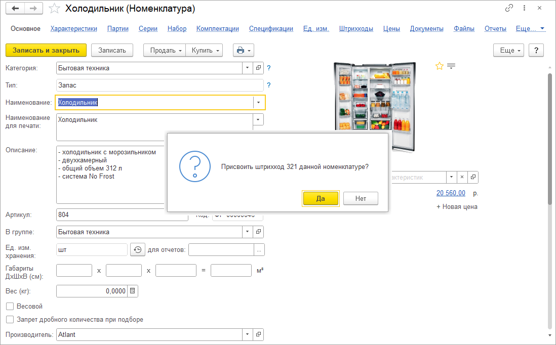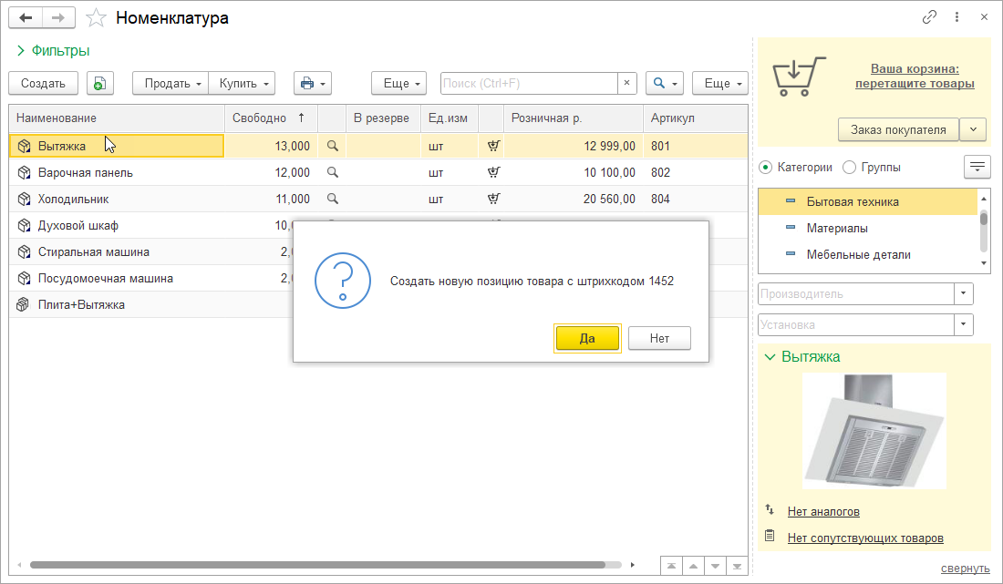 Например, если отсканировать новый штрихкод в форме списка справочника “Номенклатура” программа предложит создать новый товар. В карточке товара автоматически сохранится отсканированный штрихкод.