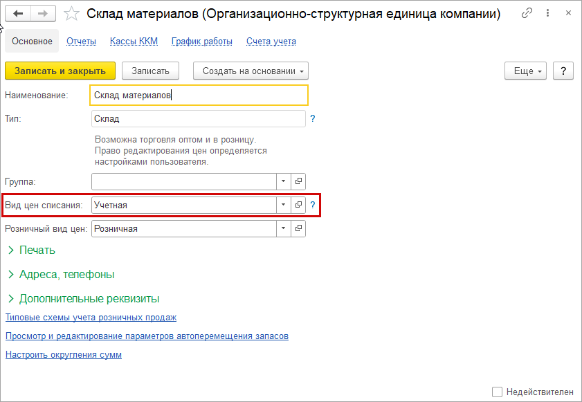 Для заполнения цены и расчета суммы списываемых запасов потребуется установить вид цены списания в карточке склада или подразделения (раздел Компания). Если реквизит не заполнен, то в документ будет подставлена розничная цена запаса.