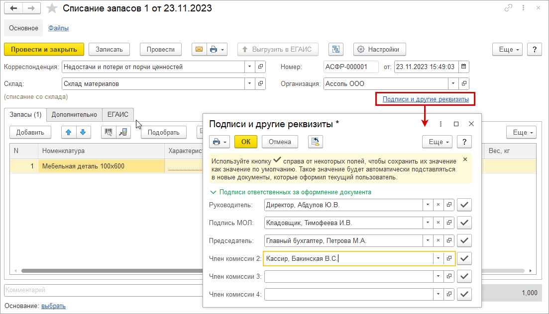 Заполнить список ответственных за оформление документа можно по ссылке "Подписи и другие реквизиты".