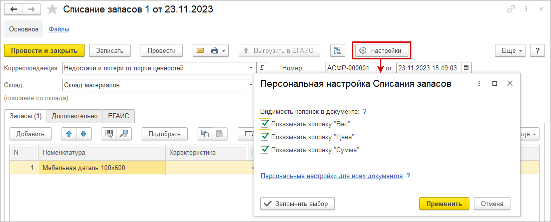 Отображение колонок "Цена", "Сумма" и "Вес" в документе регулируется в форме "Настройка" (кнопка "Настройка").