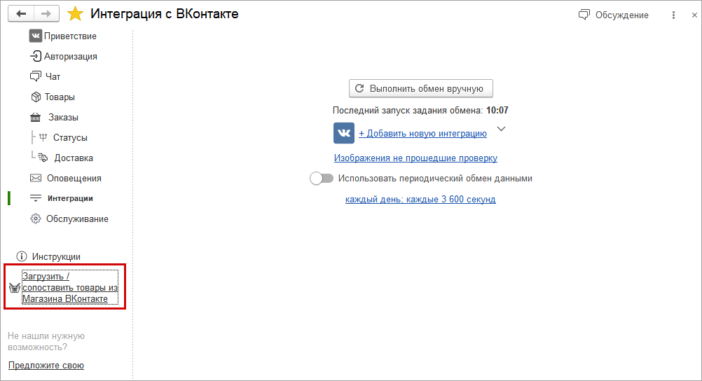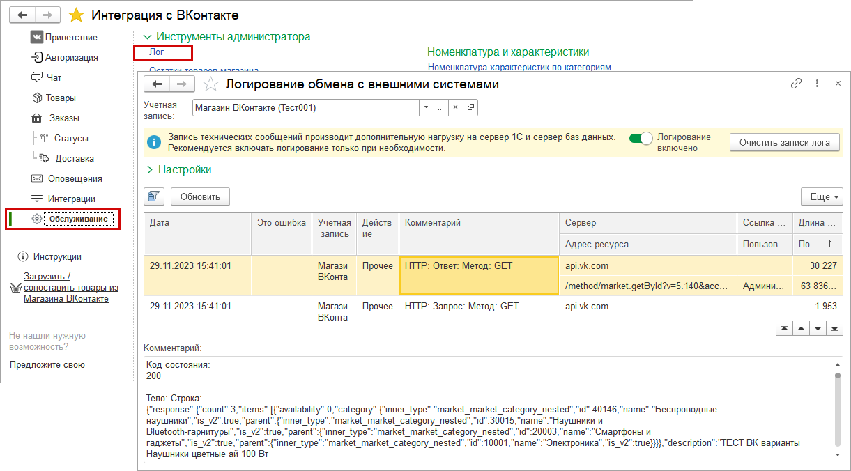 Добавлена возможность логгирования событий обмена с магазином ВКонтакте. Включить лог можно на этапе "Обслуживание" настройки интеграции.