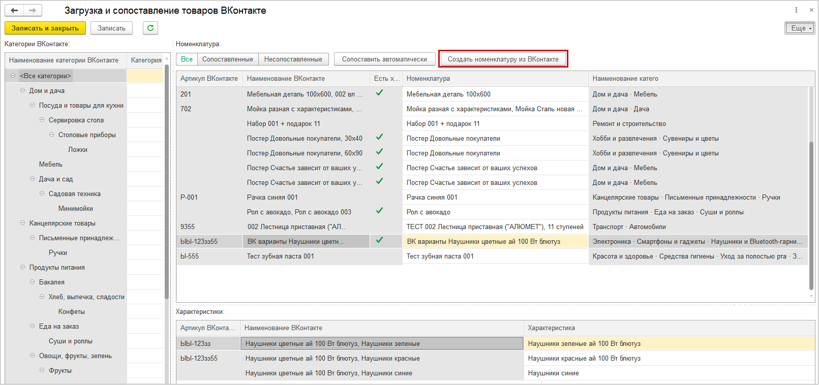 В новой форме доступны не только товары и категории, полученные из магазина ВКонтакте, но и характеристики товаров.
