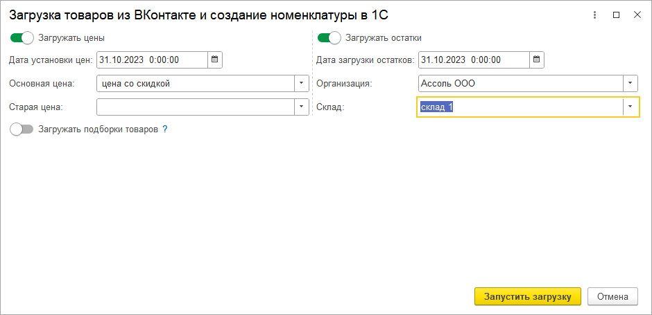 В окне загрузки товаров можно указать, загружать ли цены и остатки товаров, а также уточнить вид цен к загрузке, даты актуальности данных, организацию и склад.