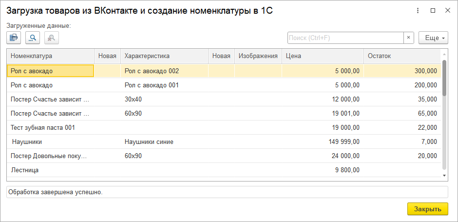 В результате выполнения загрузки отобразится список созданной в 1С номенклатуры с ценами и остатками. Двойным кликом можно перейти к новым карточкам товаров.