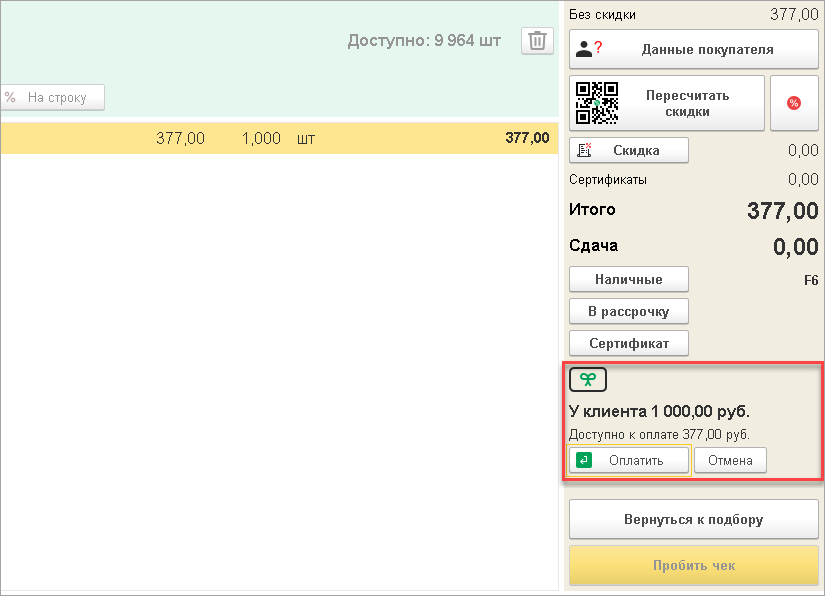 Оплата подарочным сертификатом поддерживается в документах "Чек ККМ", "Расходная накладная" и Счет на оплату". При оплате программа находит в документе подходящие под условия товары и вычисляет максимально возможную сумму оплаты сертификатом. На форме отображается два значения - остаток денежных средств на сертификате и доступная сумма к оплате.