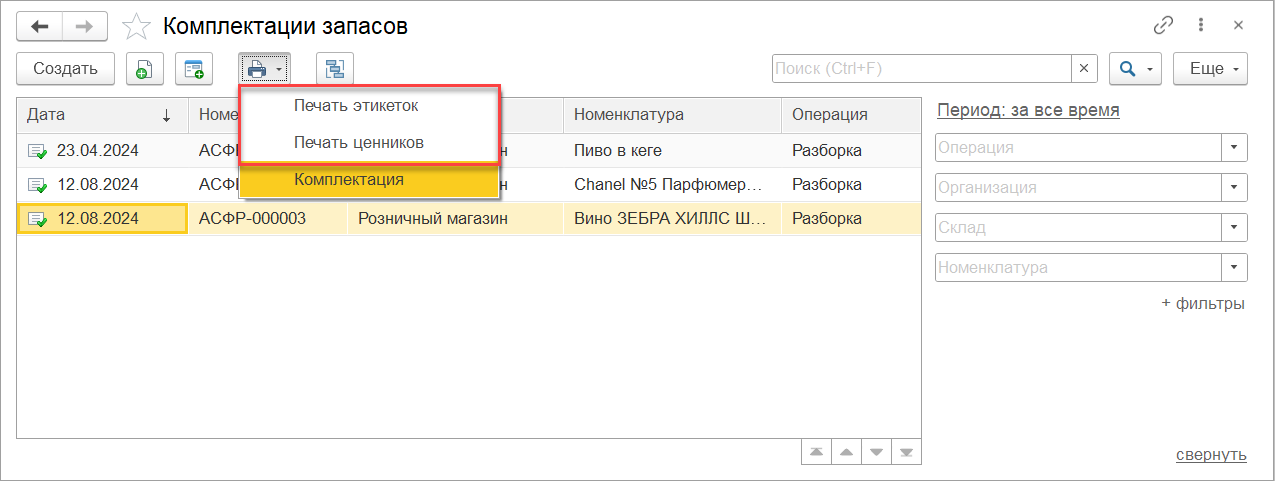 Форму печати ценников и этикеток можно открыть с помощью команд Печать ценников и Печать этикеток из меню "Печать". Для заполнения обработки печати используется информация из тех табличных частей документов, которые увеличивают остатки. Например, закладка "Продукция" в отчете о переработке или товар, указываемый в шапке документа "Комплектация".