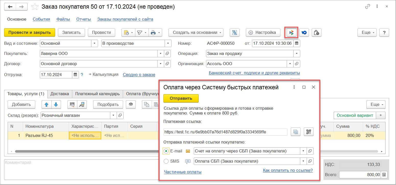 Кнопка вызова оплаты СБП добавлена в документы "Заказ покупателю", "Счет на оплату", "Расходная накладная" и "Акт выполненных работ".