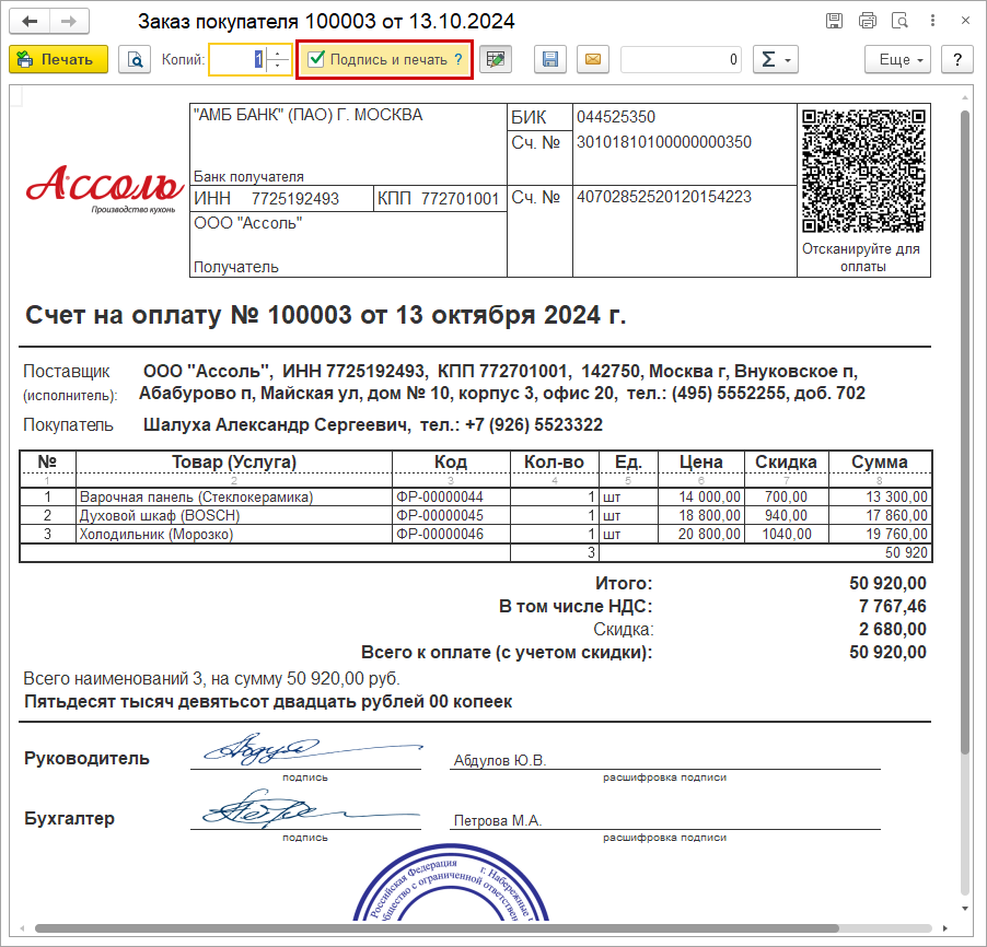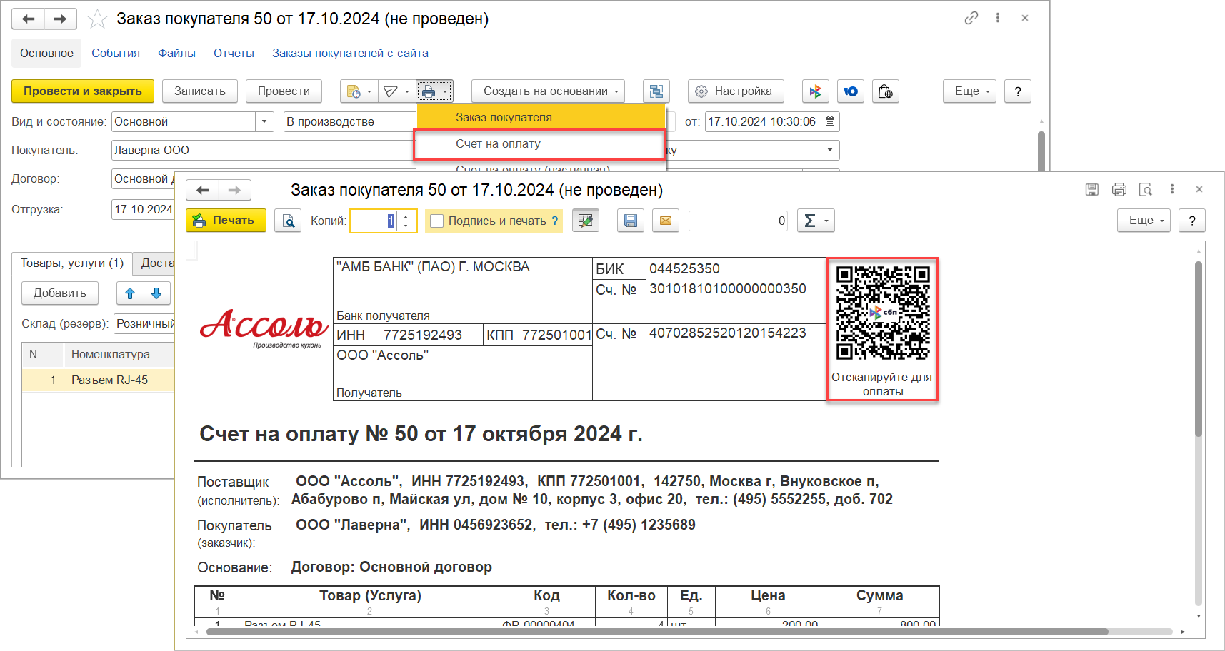 Можно переслать или распечатать "Счет на оплату". После формирования QR-кода он будет добавлен в счет.