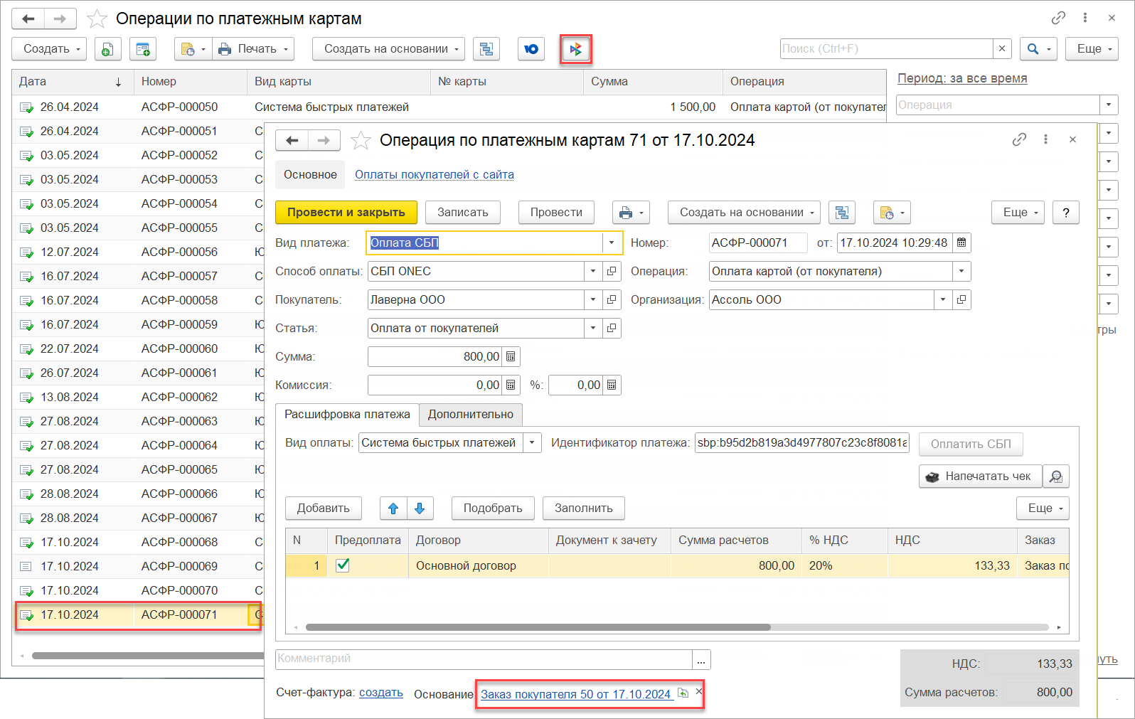 Созданный при загрузке документ оплаты связывается с исходным заказом покупателя.