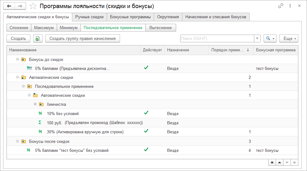 Обратите внимание, что флажок "Начисление бонусов до скидок" убрали из формы настроек бонусной программы, порядок применения настраивается только в списке.