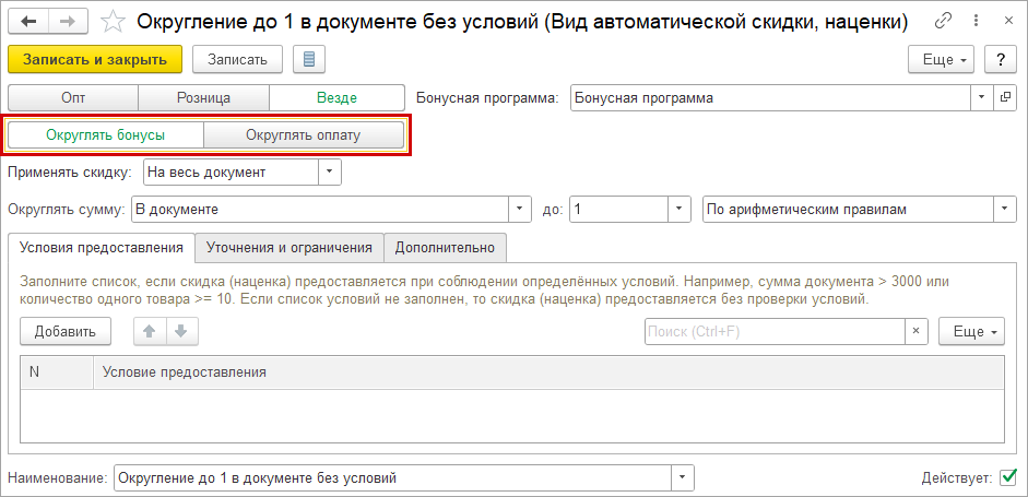В настройку округлений добавлен переключатель "Округлять бонусы / Округлять оплату". С его помощью теперь настраивается округление бонусов по конкретной бонусной программе.