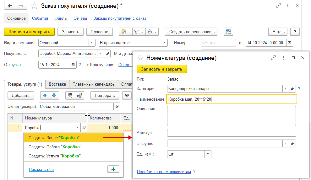 При заполнении документа теперь можно быстро создать контрагента или номенклатуру. Упростили формы добавления товара и клиента: теперь если добавление отрыто при вводе наименования в документе, отображаются только поля, необходимые для записи новой карточки. Перейти к полной форме ввода можно по ссылке "Перейти ко всем реквизитам".