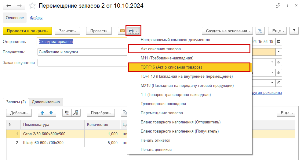 В документ "Перемещение запасов" для операции "Списание на расходы" добавили две новые печатные формы "Акт о списании товаров" и "ТОРГ16". Реализовали настройку отображения цены и суммы в печатной форме.