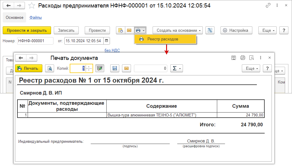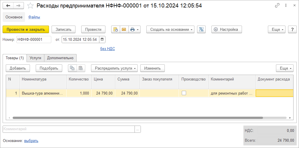 Документ отражает покупку товаров и услуг за счет личных средств предпринимателя. Порядок создания и заполнения документа приближен к документу "Приходная накладная".