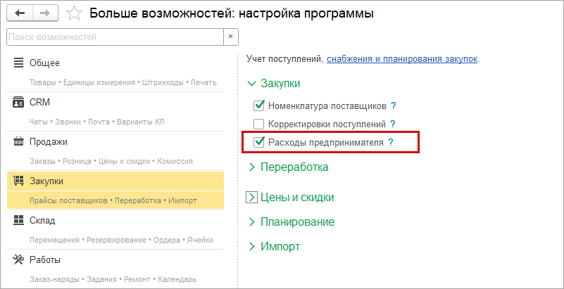 Чтобы отражать расходы предпринимателя включите настройку "Расходы предпринимателя" в разделе Настройки – Еще больше возможностей – Закупки.