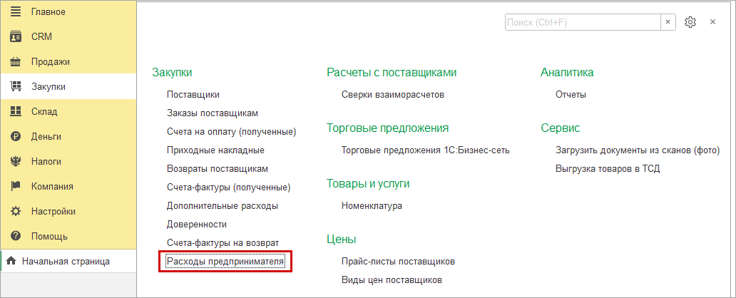 После установки флажка в разделе "Закупки" появится ссылка на список документов "Расходы предпринимателя".