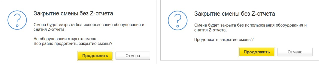 При продолжении закрытия смены без z-отчета закрывать смену на оборудовании придется средствами драйвера устройства. Поэтому для принятия решения важно знать, открыта ли смена на кассовом аппарате.