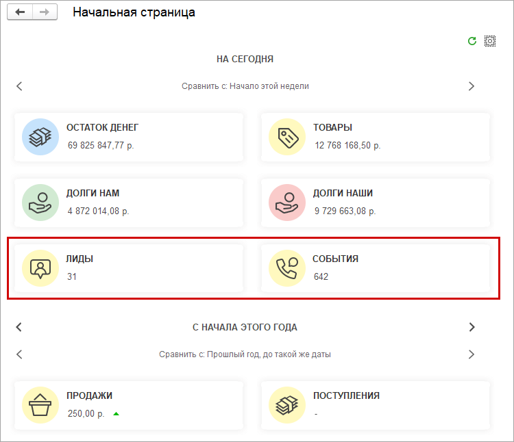 В пульс бизнеса добавлены новые показатели. Появилась возможность отслеживать результаты работы с лидами и контрагентами, конверсию и среднее время обработки заказа покупателя, прогресс обработки событий и выполнения задач в режиме реального времени. Контролировать эффективность работы отдела продаж теперь можно без дополнительных отчетов.