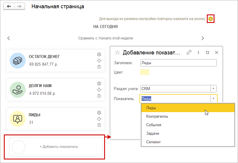 Все новые показатели добавляются и гибко настраиваются. Для добавления нажмите на "шестеренку", а затем на поле "+ Добавить показатель" в соответствующей группе показателей на дату или за период.