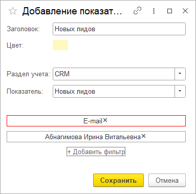 Для всех показателей можно применить отборы, которые могут использоваться совместно в различных комбинациях. Например, в показатель на рисунке ниже будут включены лиды одного менеджера с источником привлечения кроме "E-mail".