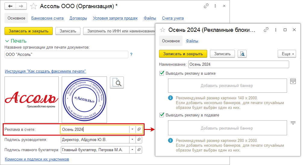 Универсальный баннер для всех счетов настраивается в карточке организации, если картинок для баннера несколько, при печати счета подставится случайная картинка.