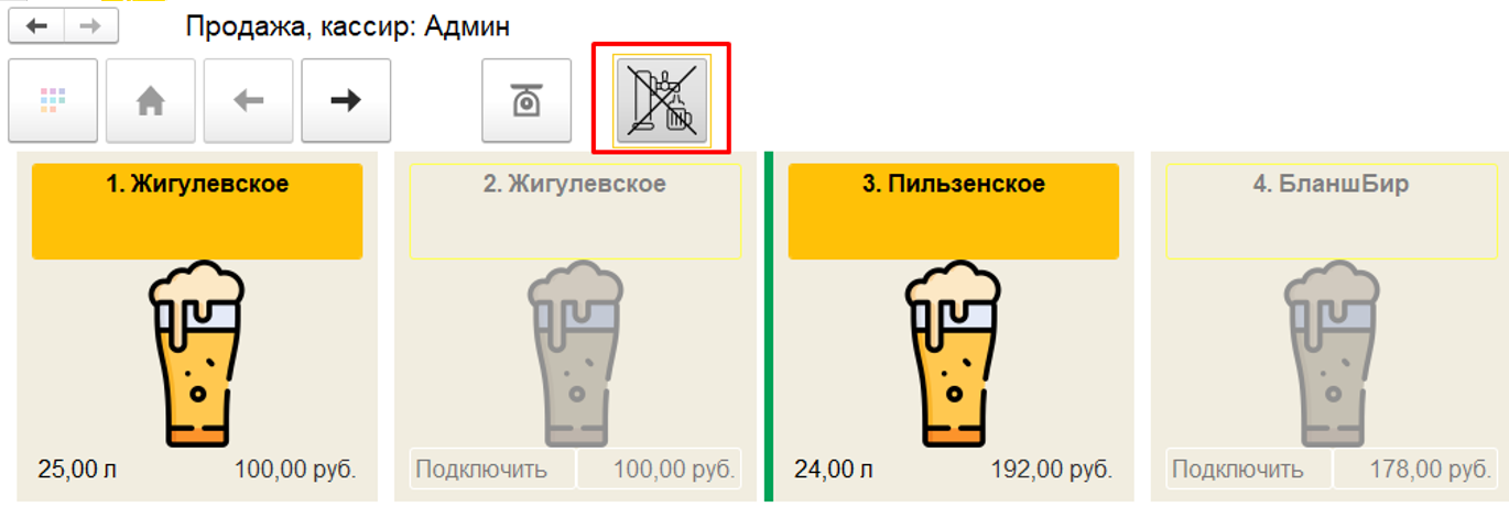 Сделали процесс продажи разливного пива еще проще. Теперь можно работать с подключенными "кранами" в плиточном интерфейсе. На плитке конкретного вида пива будет виден подключенный кег и его остаток. Здесь же можно быстро подключить новый и отключить пустой кег. Дополнительно стало удобнее подбирать сопутствующий товар.