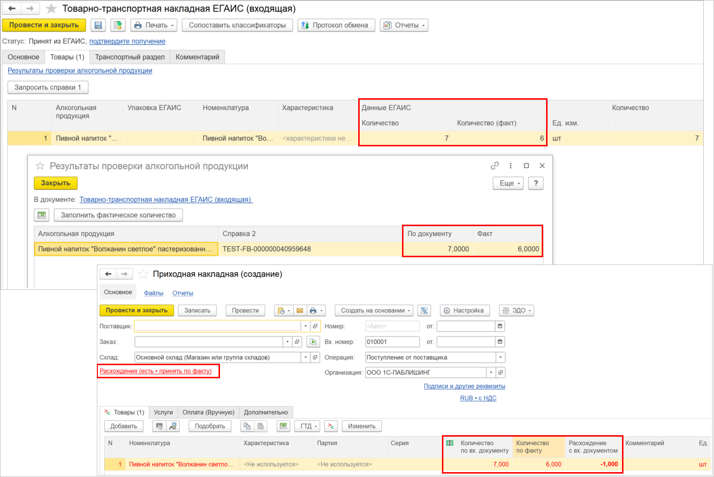Добавили возможность заполнения "Приходной накладной" на основании "ТТН ЕГАИС входящей", содержащей расхождения.