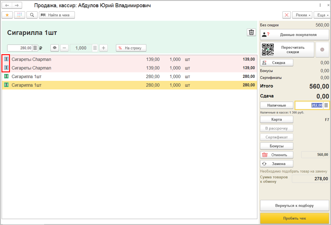 Поддержали возможность замены маркированного товара встречным предоставлением, в том числе с доплатой. Теперь можно легко заменить не только обычный, но и маркированный товар при возврате, например, если клиент выбрал не тот товар, ошибся с размером обуви или одежды. Продавец в режиме "Возврат" сканирует марку возвращаемого товара, нажимает кнопку Замена и добавляет новый товар. Проверенные марки на возврат выделятся серым цветом и повторно проверятся на ККТ при пробитии.