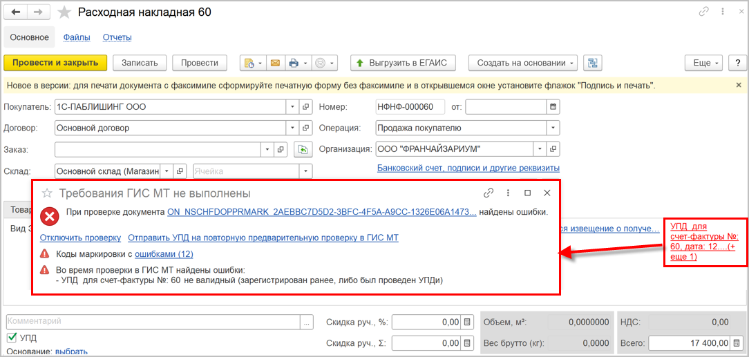 Результаты проверки отобразятся на формах документов "Приходная накладная" и "Расходная накладная" в разделе ЭДО.