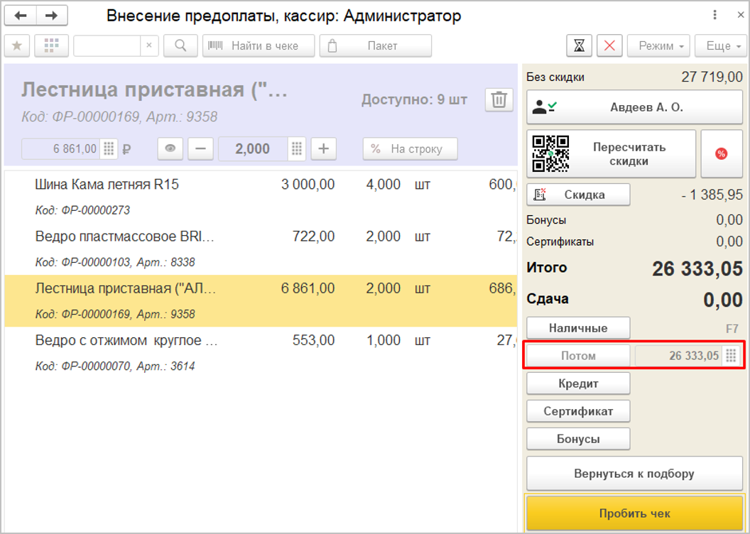 В режиме "Предоплаты" нет контроля остатков товаров, так как вносятся денежные средства без передачи товаров. В поле "Потом" отображается неоплаченный остаток.