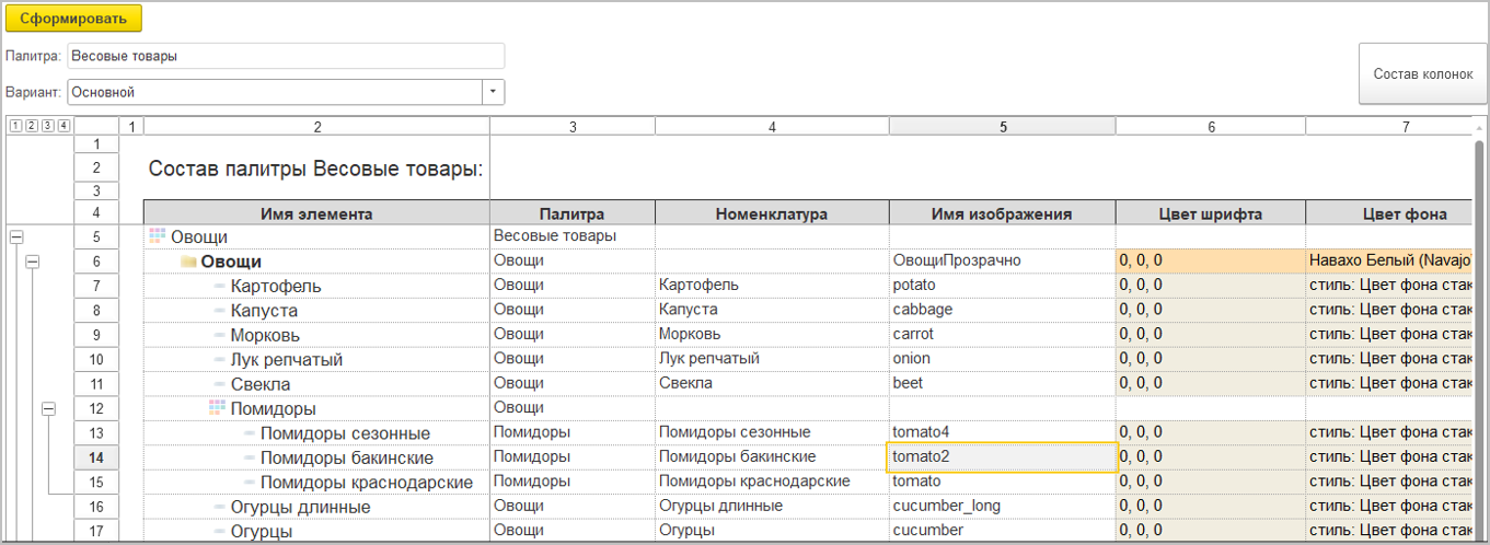 Новый отчет "Состав палитры" показывает ее структуру с учетом всех вложенных палитр, доступен вариант отображения с ценами номенклатуры.