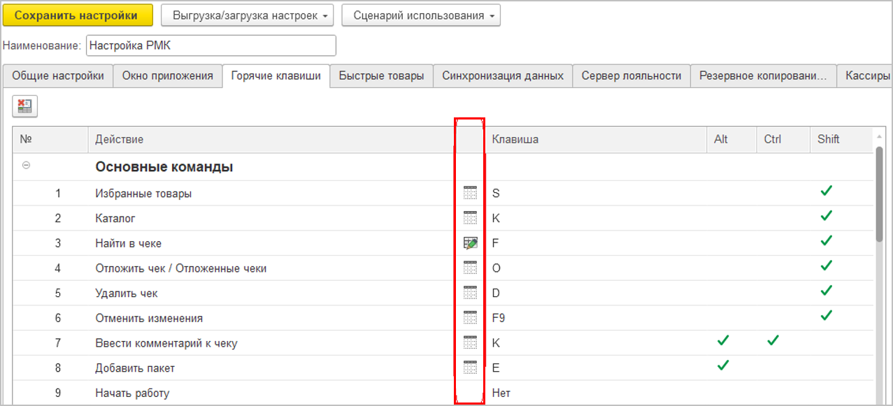 Индивидуальная настройка кнопок выполняется на странице "Горячие клавиши" настроек РМК, здесь же в табличную часть добавлена колонка со статусами настроек.