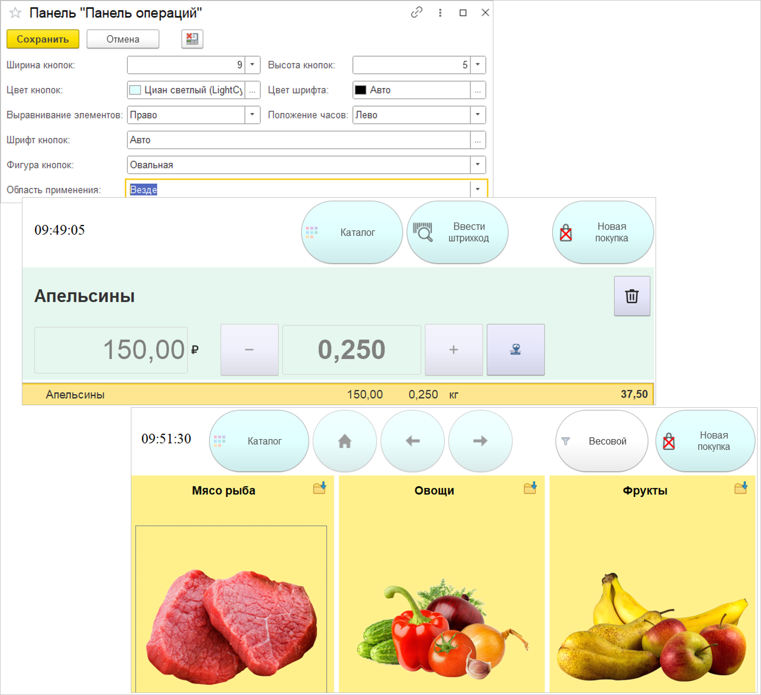 Добавили возможность настраивать внешний вид кнопок и шрифт списка товаров выравнивать элементы и отображать часы на панели операций. Можно указать параметры для всей панели кнопок и индивидуально для конкретной.