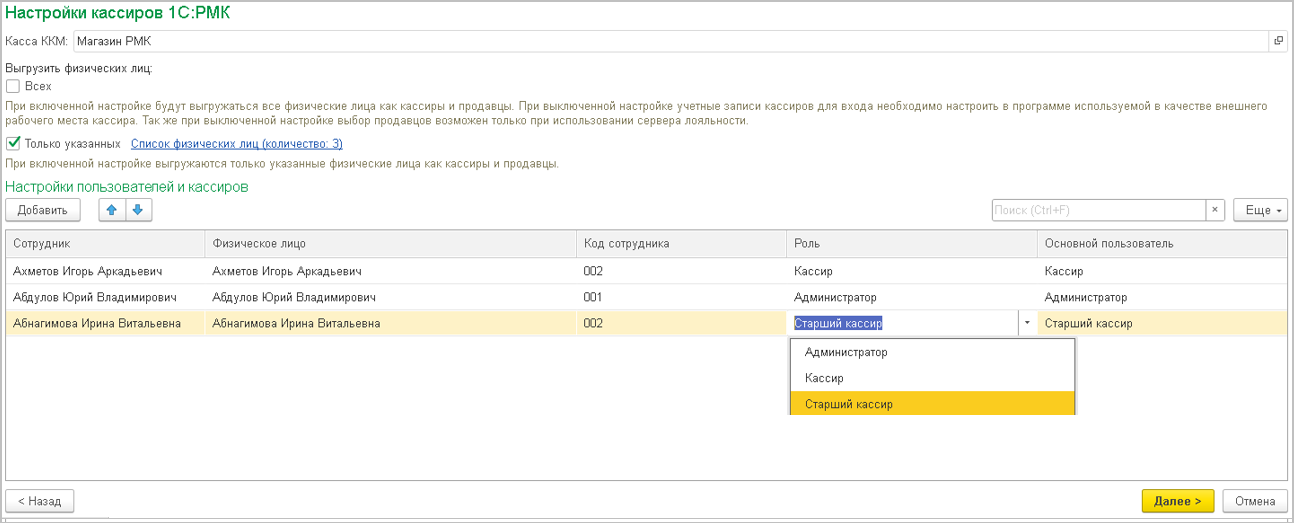 При совместной работе с 1С:РМК появилась возможность настраивать сотрудников в управляющей программе. Теперь администратор может произвести первоначальную настройку пользователей через настройки обмена, а так же изменить настройку уже существующего обмена.
