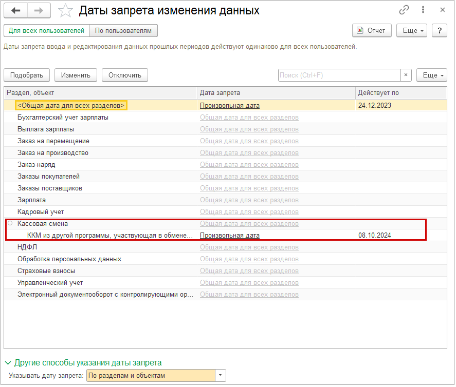Появилась возможность устанавливать дату запрета изменения отчета о розничных продажах. При вариантах настройки даты запрета "По объектам" и "По разделам и объектам" в списке разделов появился пункт "Кассовая смена", внутри которого можно выбрать кассу и установить для каждой из них индивидуальную дату запрета изменений. Детализировано отображение итоговой суммы по безналичным платежам в отчете о розничных продажах. Теперь сумма отражается гиперссылкой: при нажатии появится расшифровка платежей по разным видам оплат. Заголовок итоговой суммы теперь отображается как "Безналичная оплата".