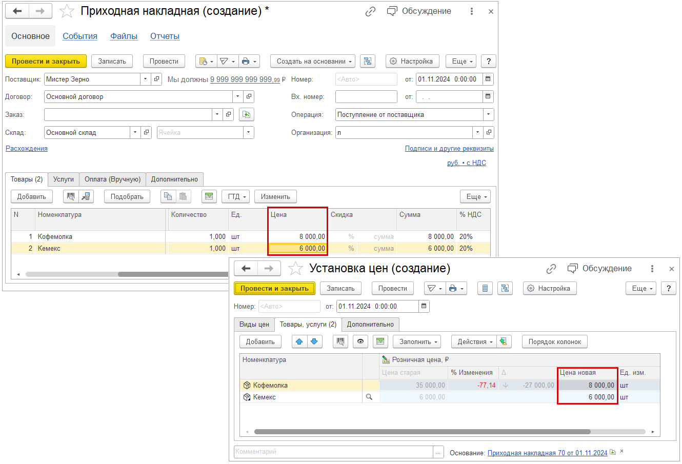 Сделали проще установку цен. При активном для вида цен флажке "Заполнять из документа-основания" документ "Установка цен", созданный на основании приходной накладной, заполнится ценами документа. Если флажок не установлен, то документ "Установка цен" будет заполняться актуальными ценами для данной номенклатуры.