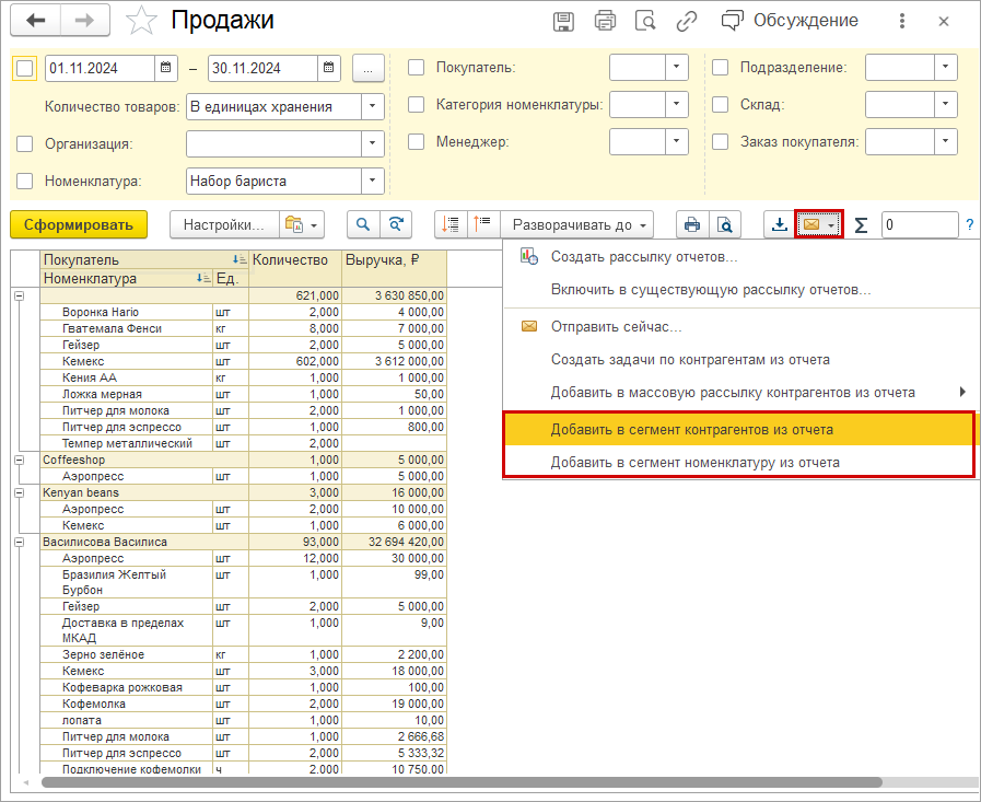 Объединить покупателей и товары в сегменты стало проще, а настройка сегмента стала более гибкой. Теперь контрагента или номенклатуру можно добавить в сегмент непосредственно из отчета. Появилась возможность сформировать сегмент на основании даты первой или количества дней с последней покупки. Например, можно выделить сегмент клиентов, которые покупали более месяца назад, и сделать по ним рассылку.