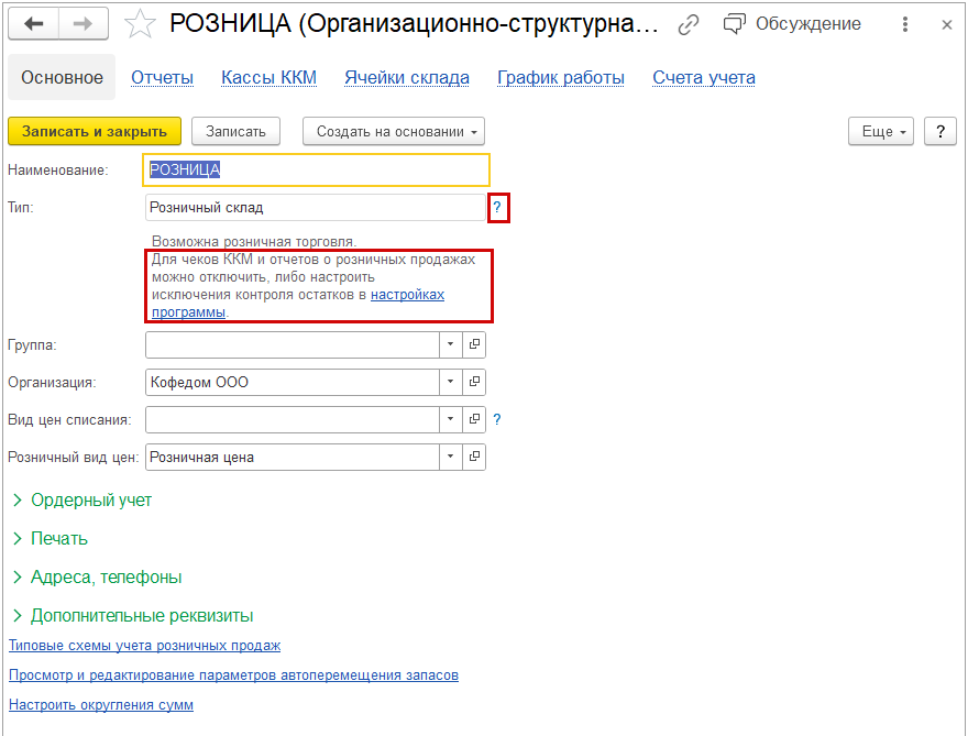 В карточке розничного склада теперь отображается подсказка с указанием на возможность отключения контроля остатков в розничных продажах. Текст подсказки содержит ссылку, по которой можно перейти к настройкам розничных продаж и контроля остатков. Подсказка со ссылкой на настройки также добавлена в общую подсказку, доступную по кнопке "?".
