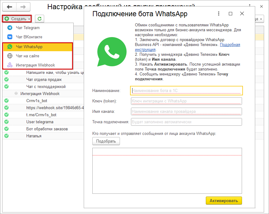 Для настройки новых возможностей в разделе Настройки - Интеграции - Чаты и видеозвонки - Сообщения из других программ по кнопке Создать выберите "Чат WhatsApp", "Чат на сайте" или "Интеграцию Webhook". В форме подключения доступна краткая пошаговая инструкция и ссылка на информацию для технического специалиста.