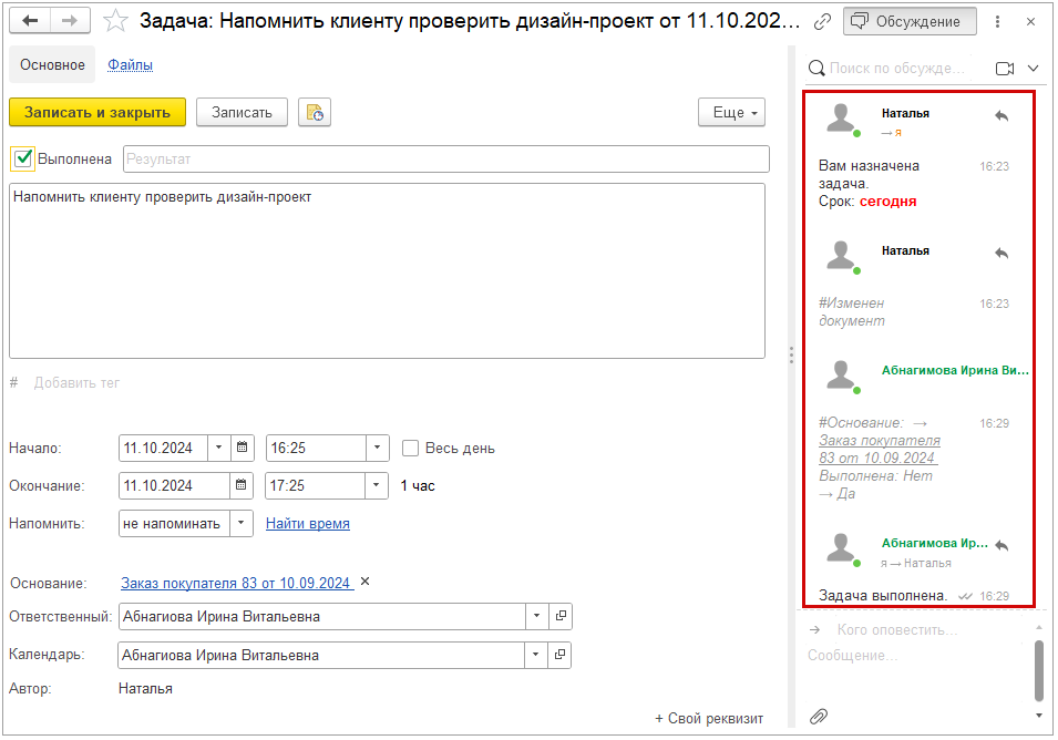 В документе "Задача" стали доступны обсуждения, где можно взаимодействовать с другими сотрудниками на тему задачи. При возникновении задачи ответственному сотруднику будет направленно уведомление о назначении, а при выполнении - автоматическое уведомление получит инициатор задачи.