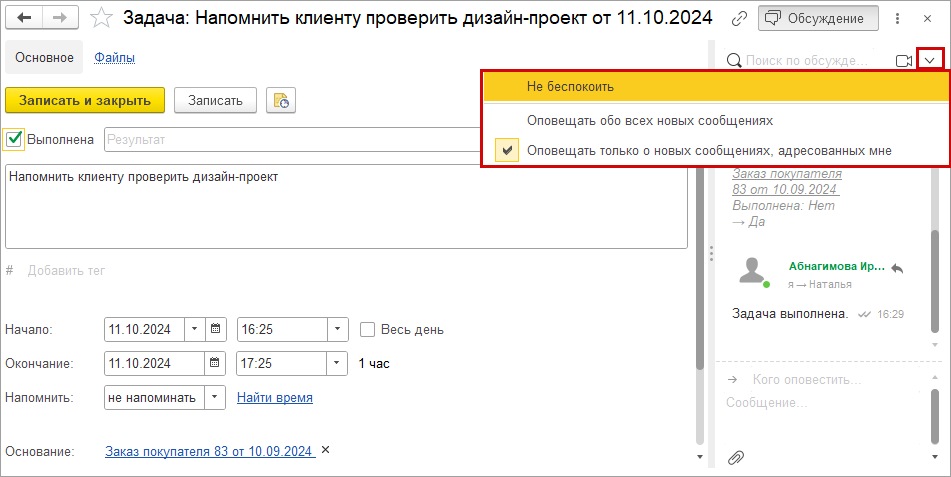 Для включения возможности подключите обсуждения в разделе: Настройки - Еще больше возможностей - CRM по ссылке "Чат и видеозвонки". Для получения уведомлений о назначении задачи установите флажок "Вам назначена задача", о выполнении - "Ваша задача выполнена" в разделе: Настройки - Мои настройки - Уведомления по задачам сотрудника.