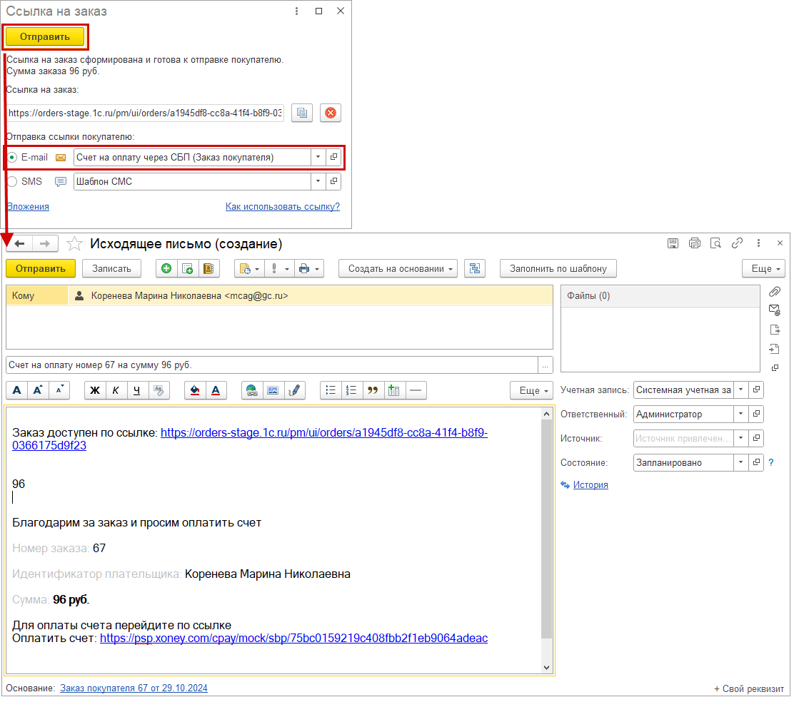 В шаблон формирования SMS или электронного письма добавлены реквизиты платежа СБП: сумма и ссылка на оплату.