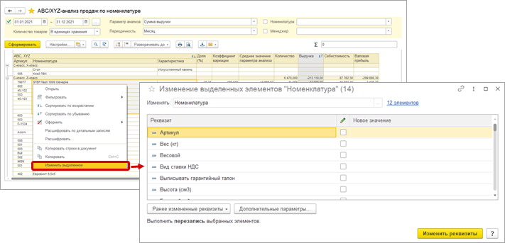 В отчет "ABC/XYZ - анализ продаж" добавили возможность выполнять команды "Групповое изменение строк" и "Копирование строк". Теперь информацию из отчета можно использовать, например, в расчете потребностей.