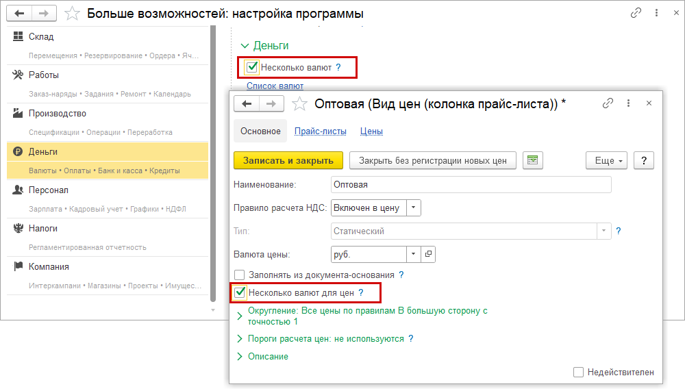 В настройки вида цен добавлен флажок "Несколько валют для цен". Отображается только если в настройках раздела "Деньги" включена функциональная опция "Несколько валют".