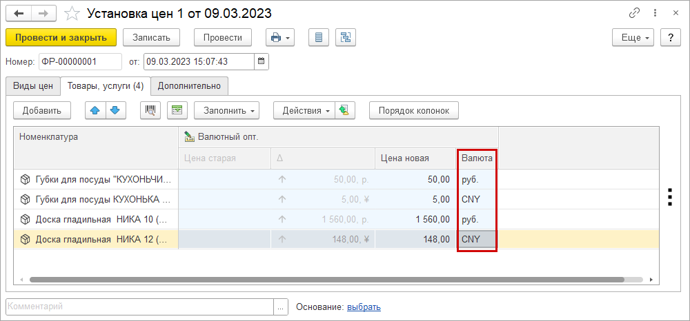 Вывод валют также добавлен в документ "Установка цен". Для мультивалютных цен можно указать валюту цены. Для прочих цен валюта выводится в заголовоке.