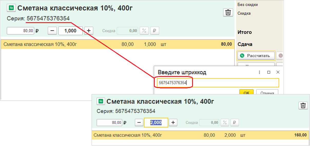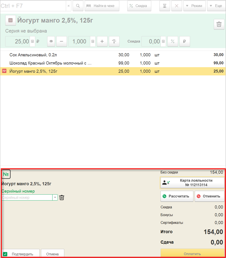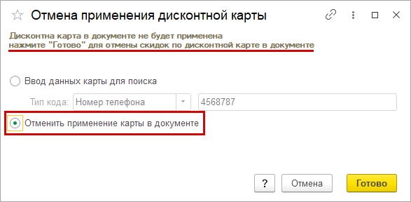 Более очевидной стала и отмена применения дисконтной карты. Теперь, отменить применение карты возможно непосредственно из окна считывания карты.